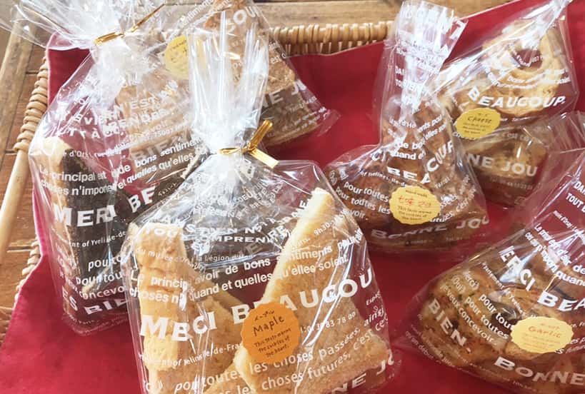 ライ麦ぱん(小豆とクルミ、カレンズ、6種のフルーツ)、天然酵母フランスパン(カンパーニュ、パン・オ・ルヴァン(クランベリーとアーモンド、いちじくとクルミ))、プチバゲット、ブール、フレッシュガーリック、まめくるみバー、シャウエッセン&チーズ、ツナフランス、ダブルチーズ、ベーコンエピなど